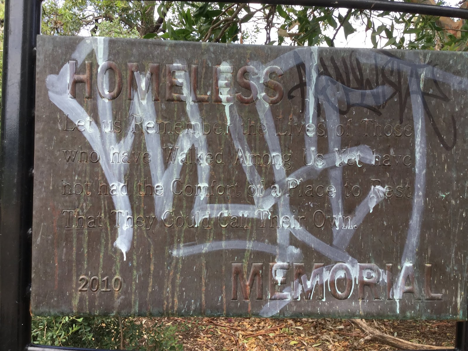 The homeless memorial at the Peanut Farm raises the issue of maintenance of public artworks. The Homeless Memorial had been spoken about by many people as a place of importance, during my research on the Great Wall of St Kilda.So when I found it (29.9.2016), I was heart-broken at its state. The interpretive plaque had been tagged, and a couple of small Texta tags were on the seat sculptures. I wondered whose responsibility it is to maintain the sculpture. I was gladdened and saddened. Where else in Melbourne do they have a homeless memorial? But also why is it in such disrepair? The two wooden sculptures made out of wood, also served as two benches but it seemed as if they had not had any recent protective coatings, or been cared for. They had cracked in several places. A large aerosol tag went across the plaque so that it could hardly be deciphered. Both seats, the plaque and the taller sculpture all bore at least one tag each.